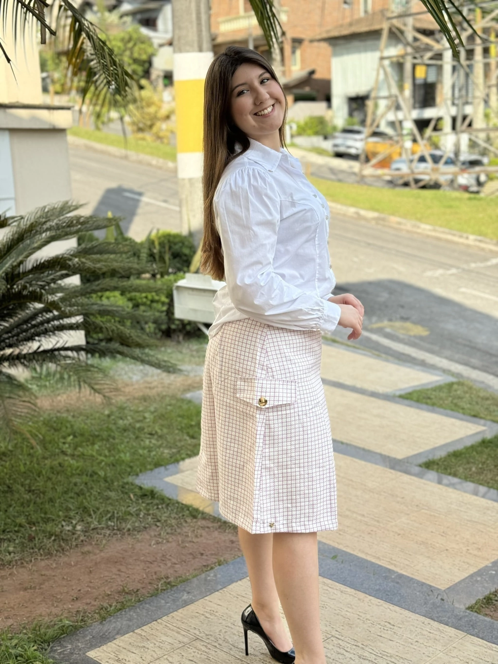 O cós alto é um detalhe elegante que realça a cintura e a silhueta, enquanto o comprimento normal da saia a torna adequada para diversas ocasiões. As lapelas com botões dourados não funcionais nas laterais são detalhes que acrescentam um toque de sofisticação e charme à peça. O fechamento posterior em zíper facilita a vestimenta. Para garantir o máximo de conforto, a saia Tata Martello é forrada, proporcionando uma sensação suave contra a pele.