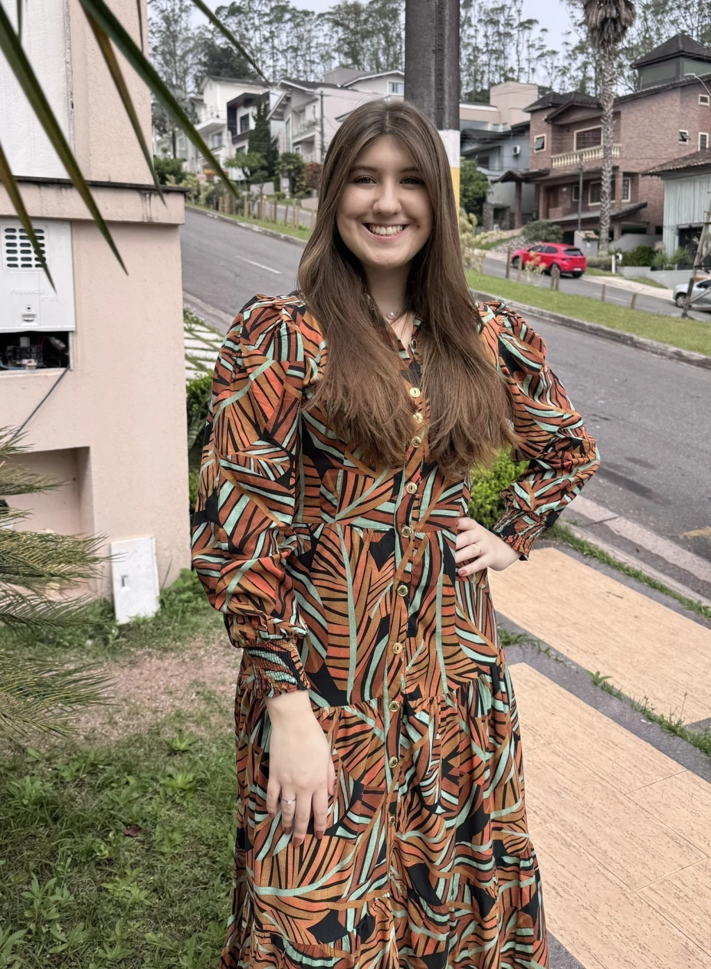 Seu comprimento é midi, modelagem evasê, saia com recorte três marias, mangas longas com elastex nos punhos, gola lapela, e todo em botões funcionais.